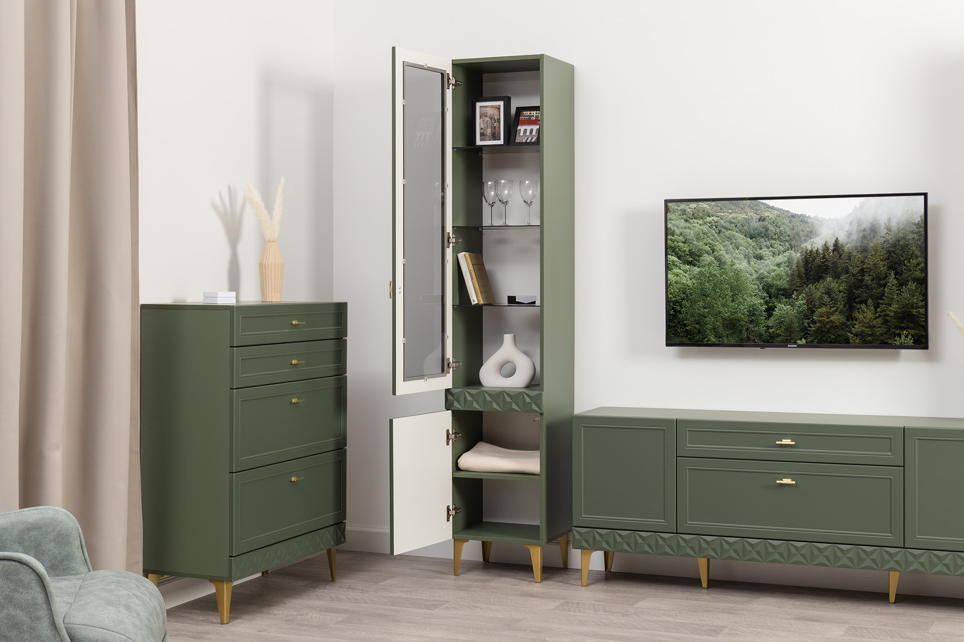 Шкаф-витрина Марион 16.397.01 дымчатый зеленый K521, олива шагрень AG 1050 ПВХ (собирается на любую сторону)