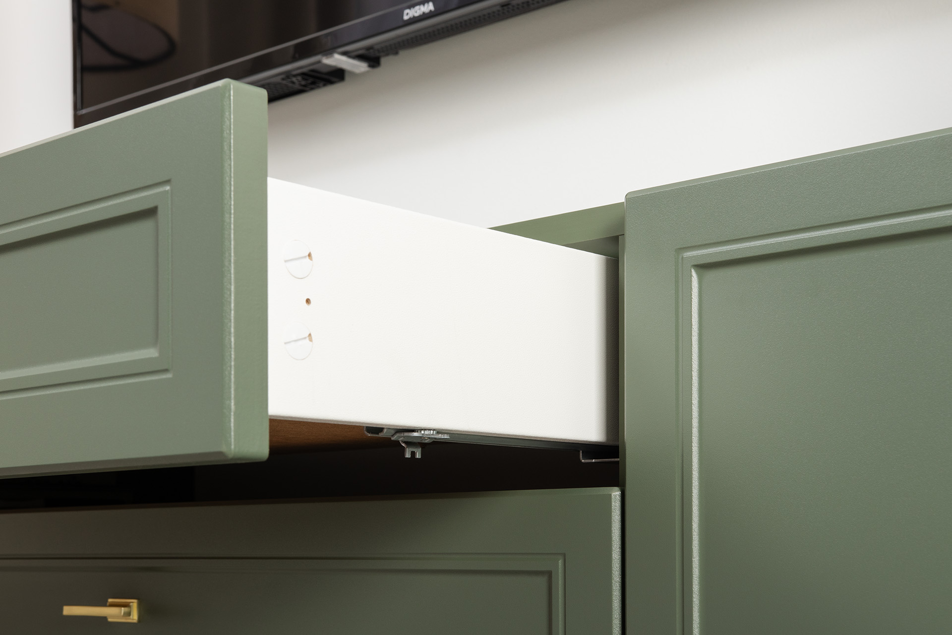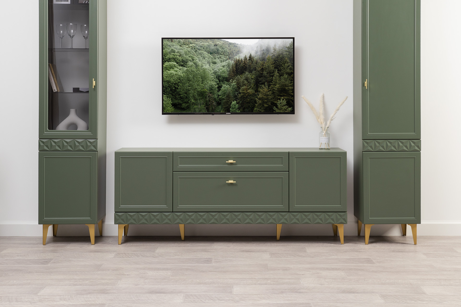 Гостиная Марион композиция 1 дымчатый зеленый K521, олива шагрень AG 1050 ПВХ, белый PE шагрень (собирается на любую сторону)