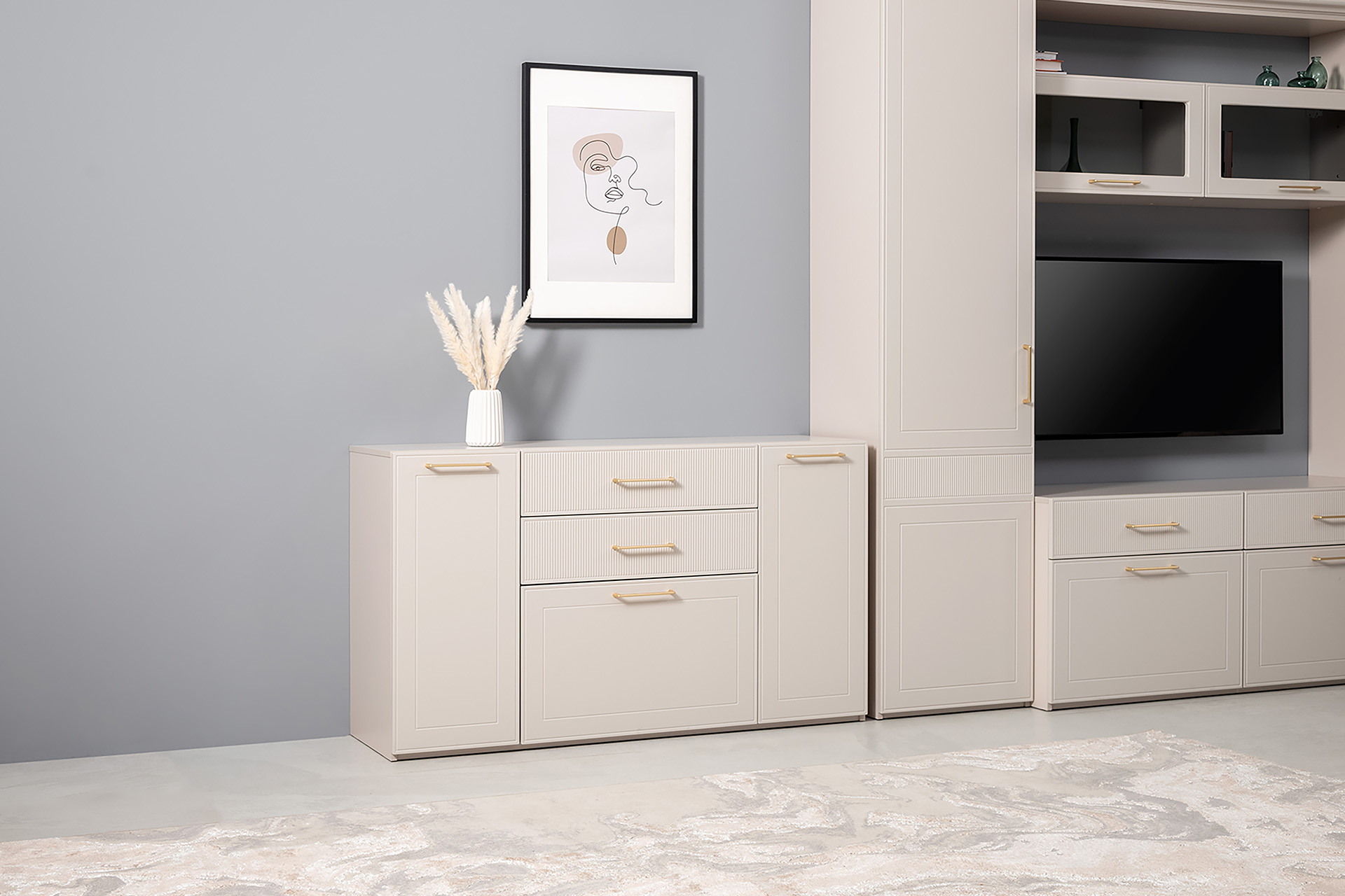 Гостиная Ричфорд композиция 2 с карнизами, кашемир 5981 BS, моно керамика D166-2 ПВХ, белый PE шагрень (собирается на любую сторону)