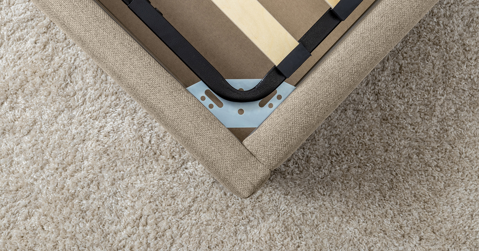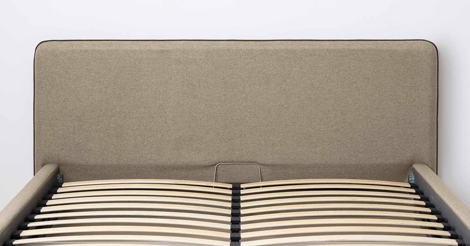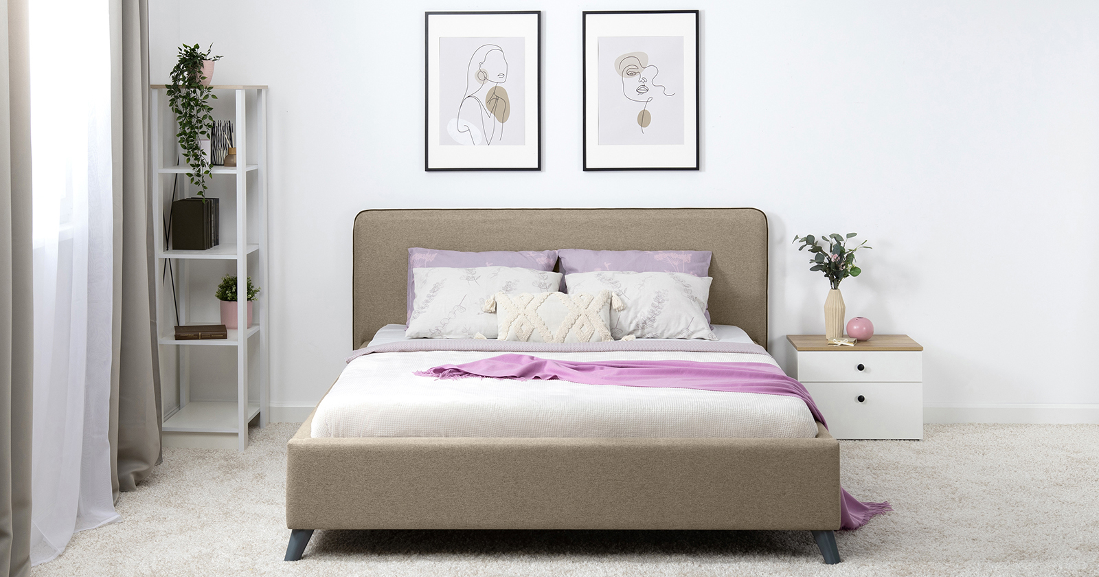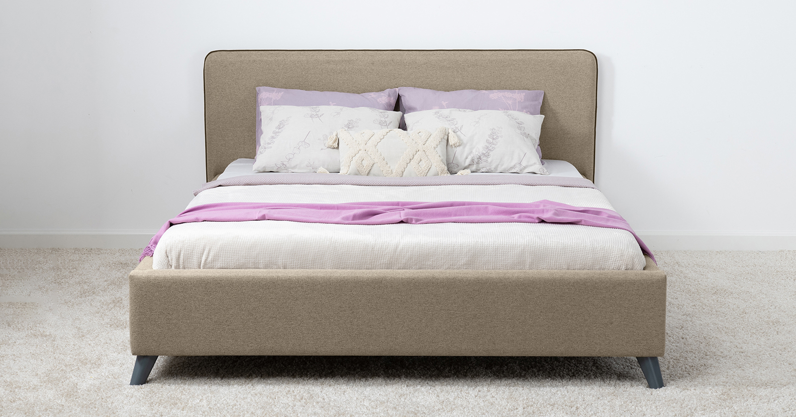 Кровать Миа 160 рогожка светло-бежевый, кант желтовато-коричневый с ортопедическим основанием и подъемным механизмом