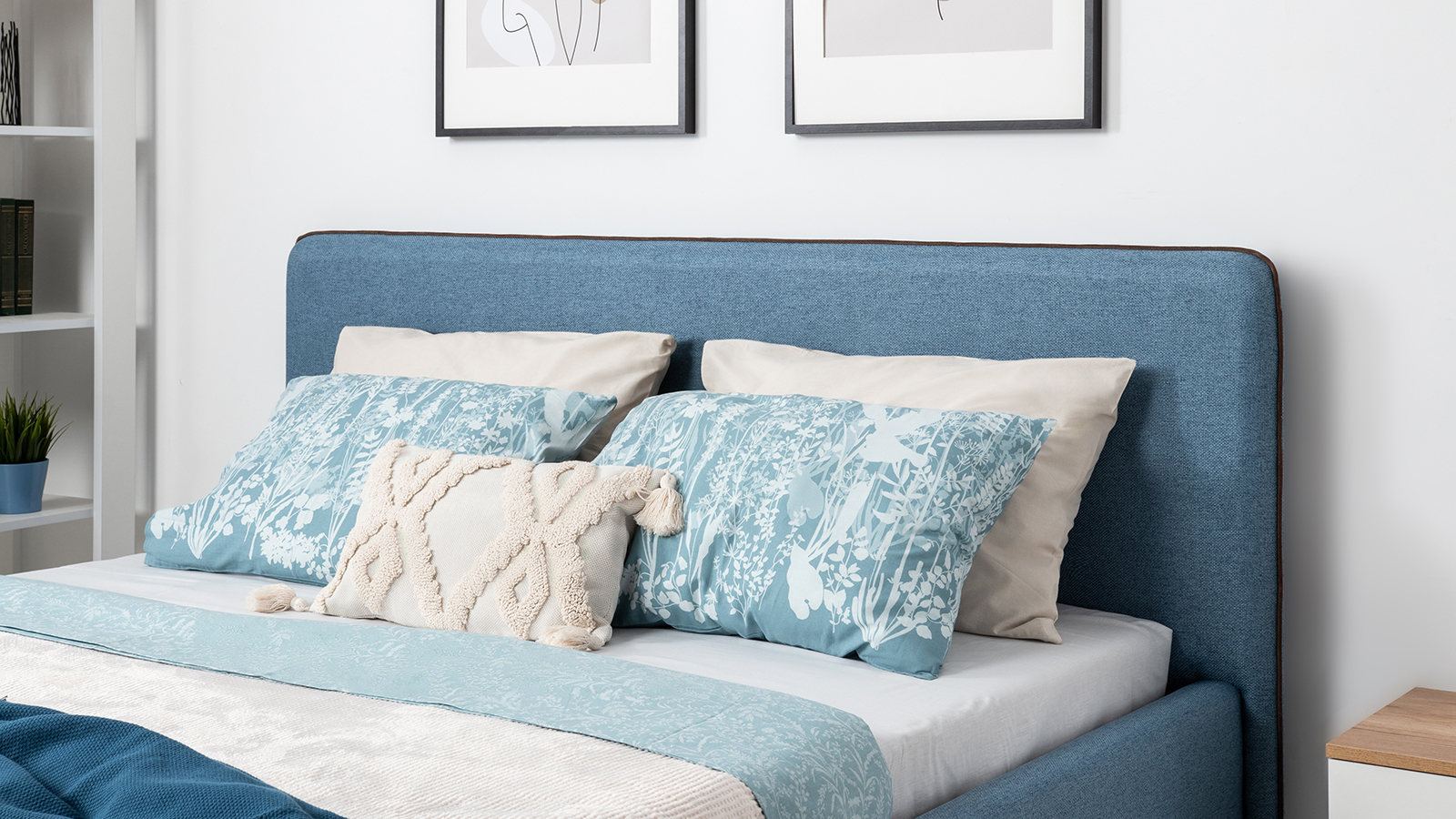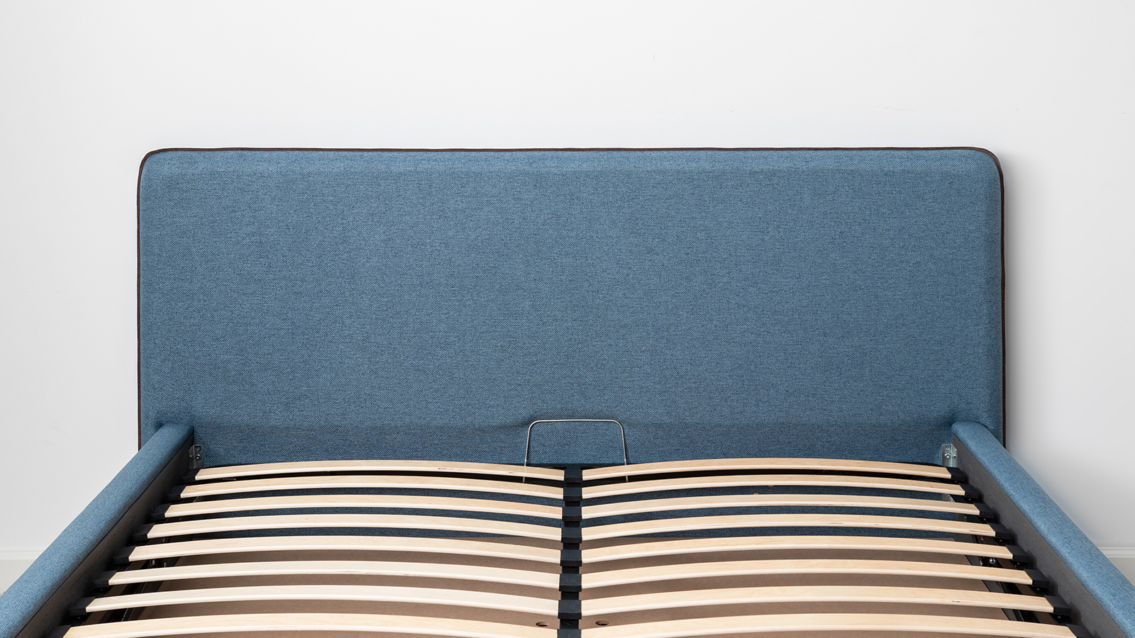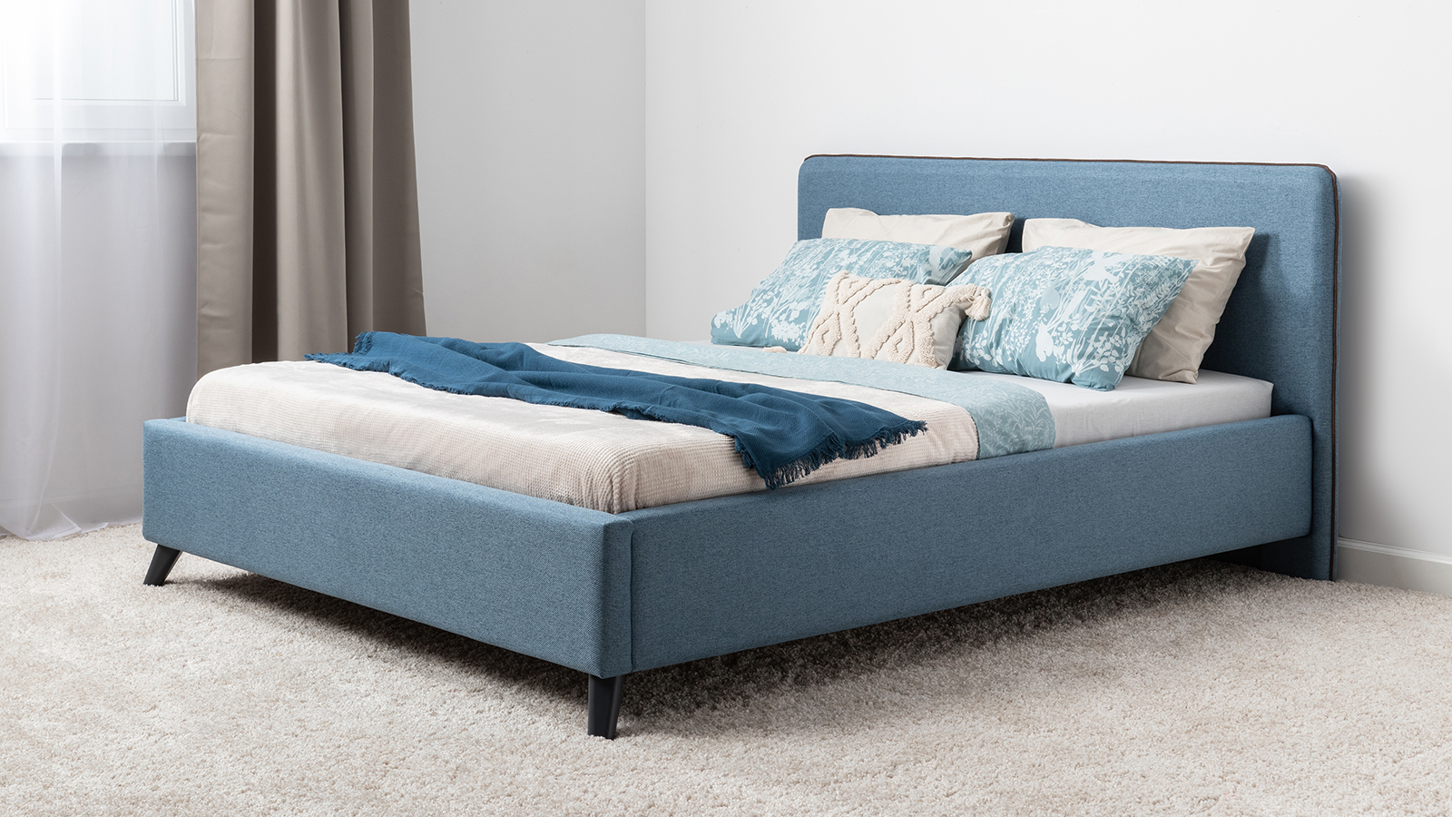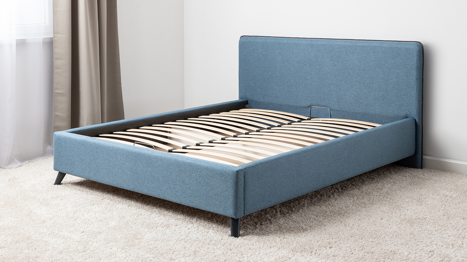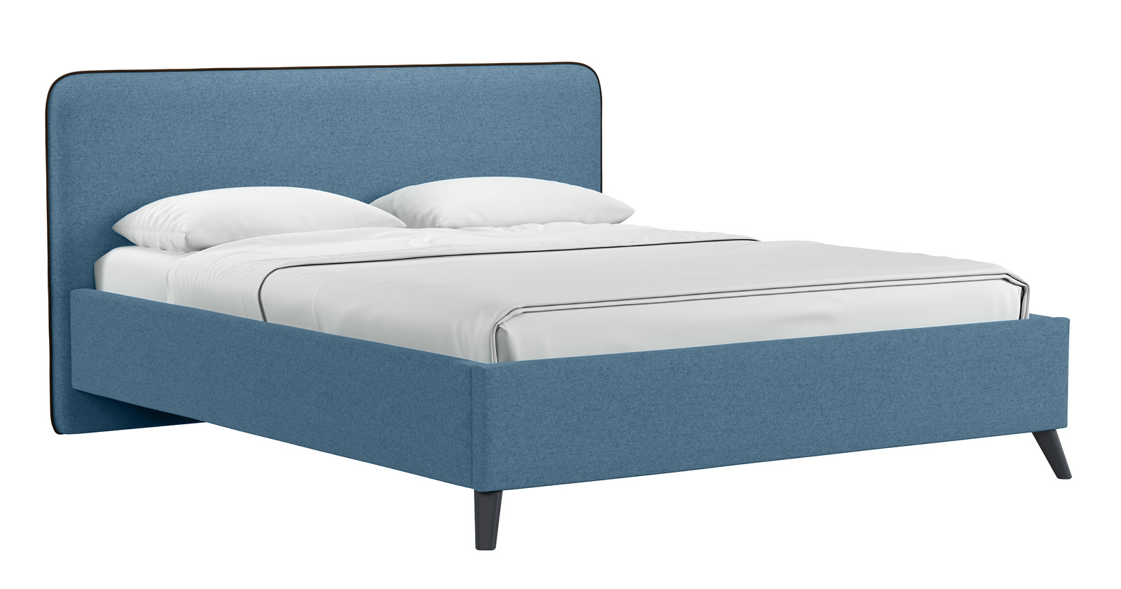 Кровать Миа 160 рогожка светло-синий, кант желтовато-коричневый с ортопедическим основанием и подъемным механизмом