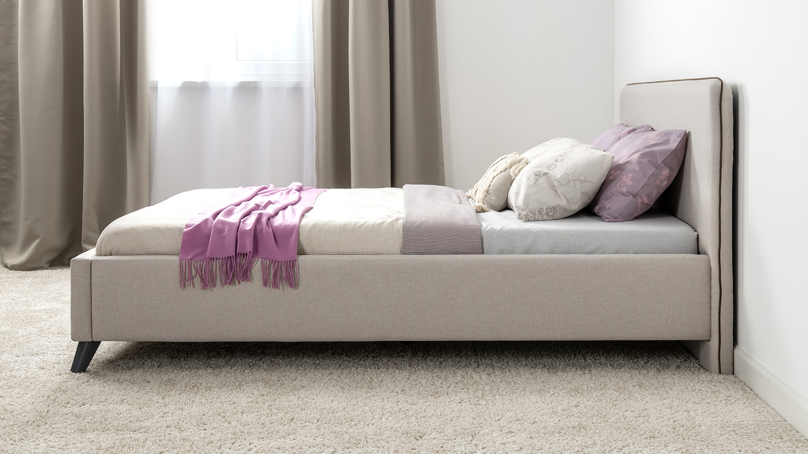 Кровать Миа 140 рогожка светло-бежевый, кант желтовато-коричневый с ортопедическим основанием и подъемным механизмом