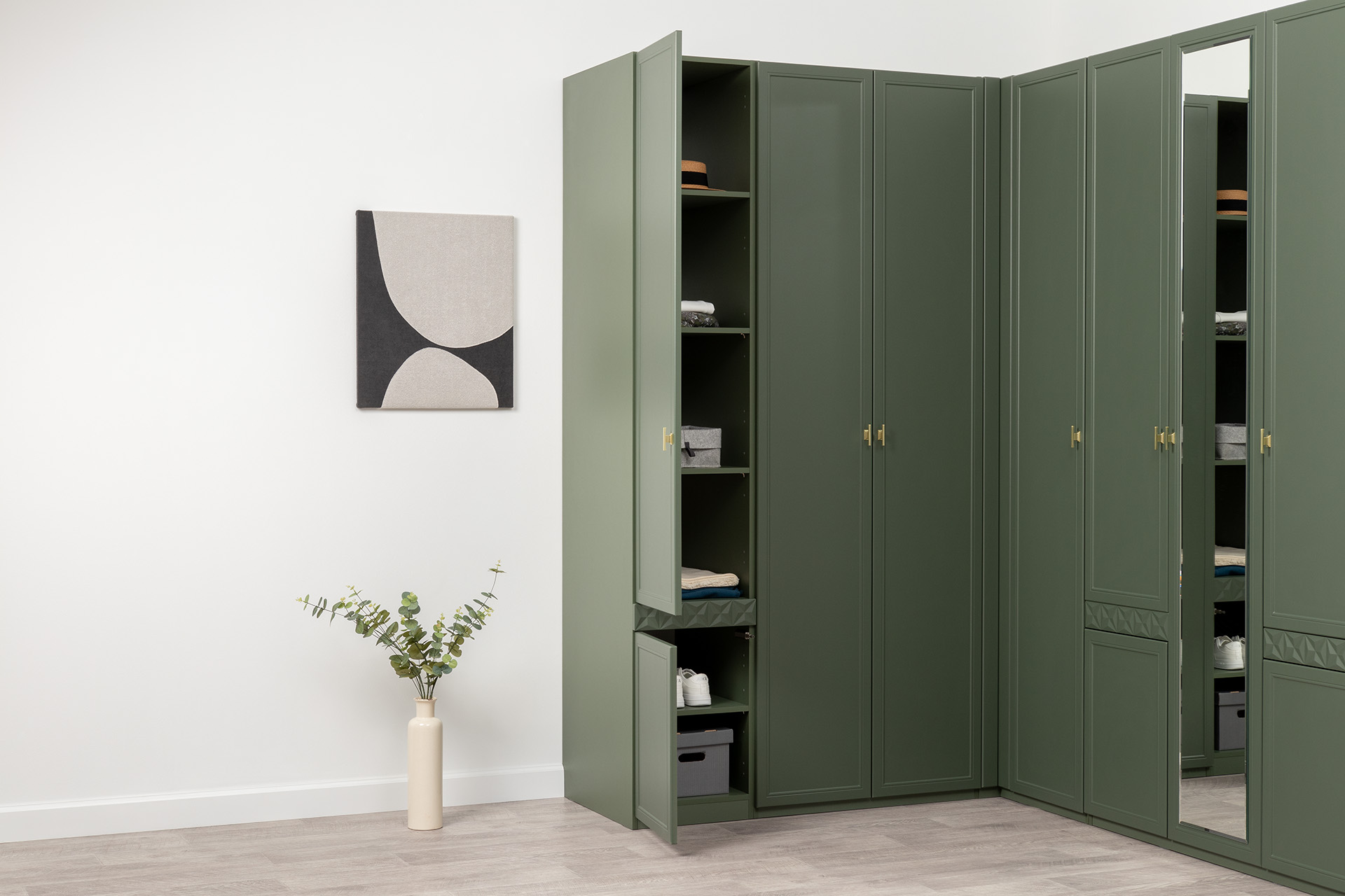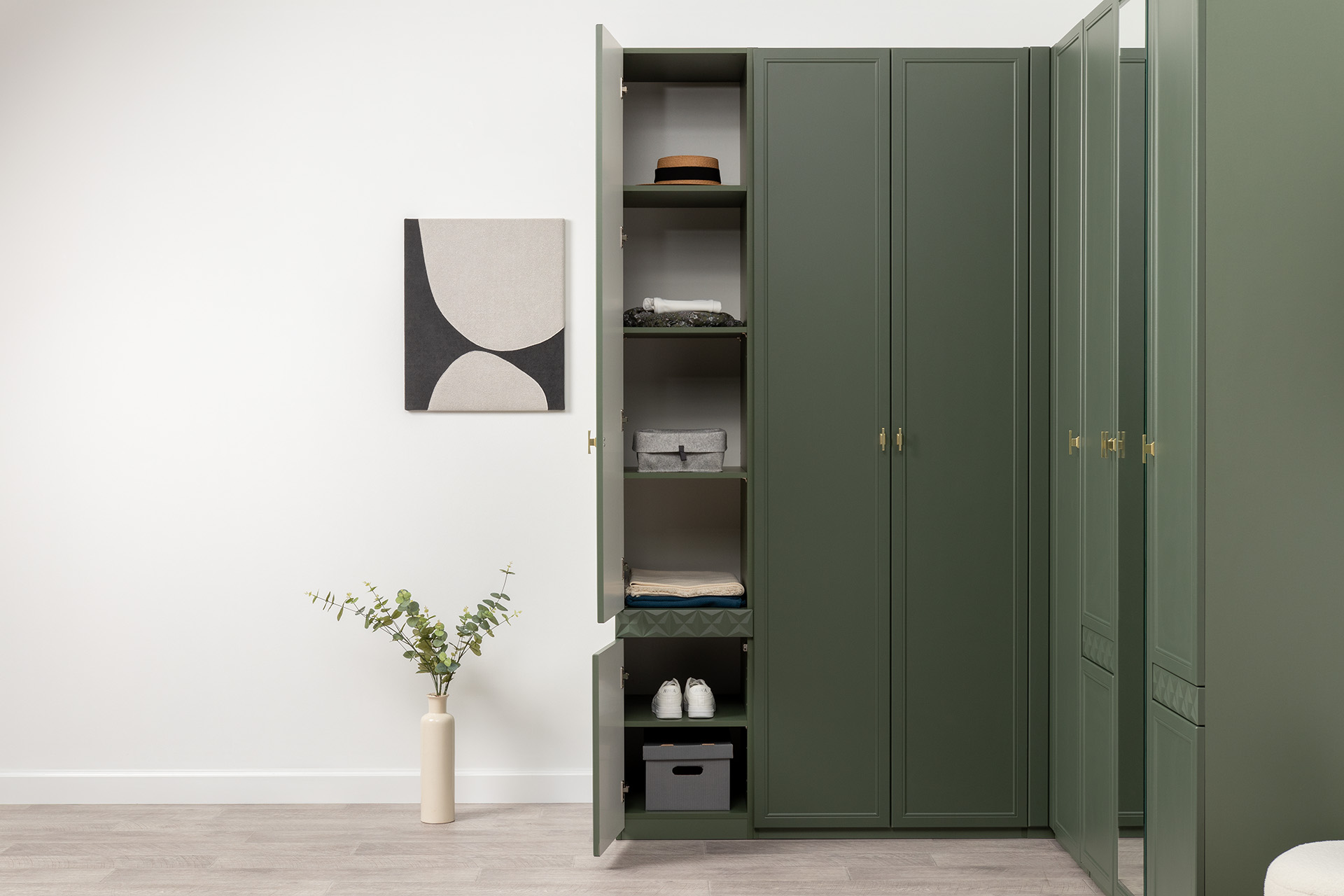 Изящные линии, глубокая фрезеровка фасадов из МДФ и благородные оттенки. Утончённая «Слоновая кость» и изысканная «Олива Шагрень» с глубоким зелёным тоном — создают атмосферу уюта, тепла и благородства. Металлические ручки и опоры золотого цвета придают мебели утончённый блеск, а петли и направляющие с доводчиками обеспечивают плавное и бесшумное закрытие фасадов.