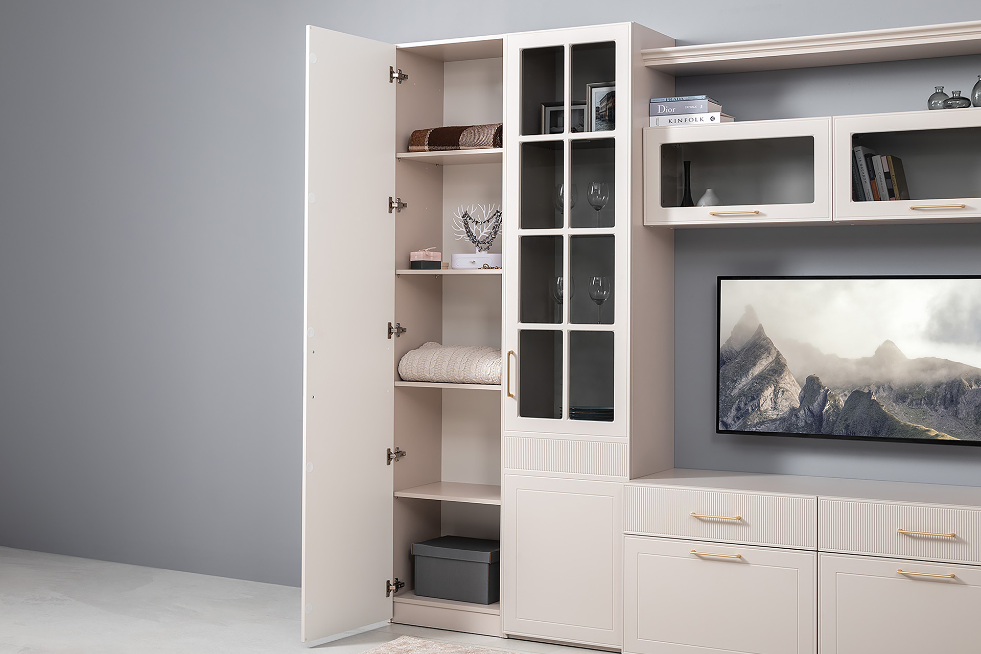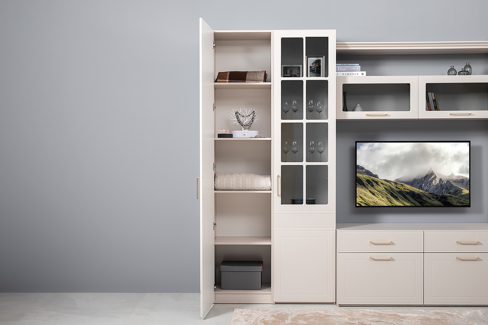 Фрезерованные фасады из МДФ, металлические ручки и витрины с тонированным стеклом создают изысканный образ.
