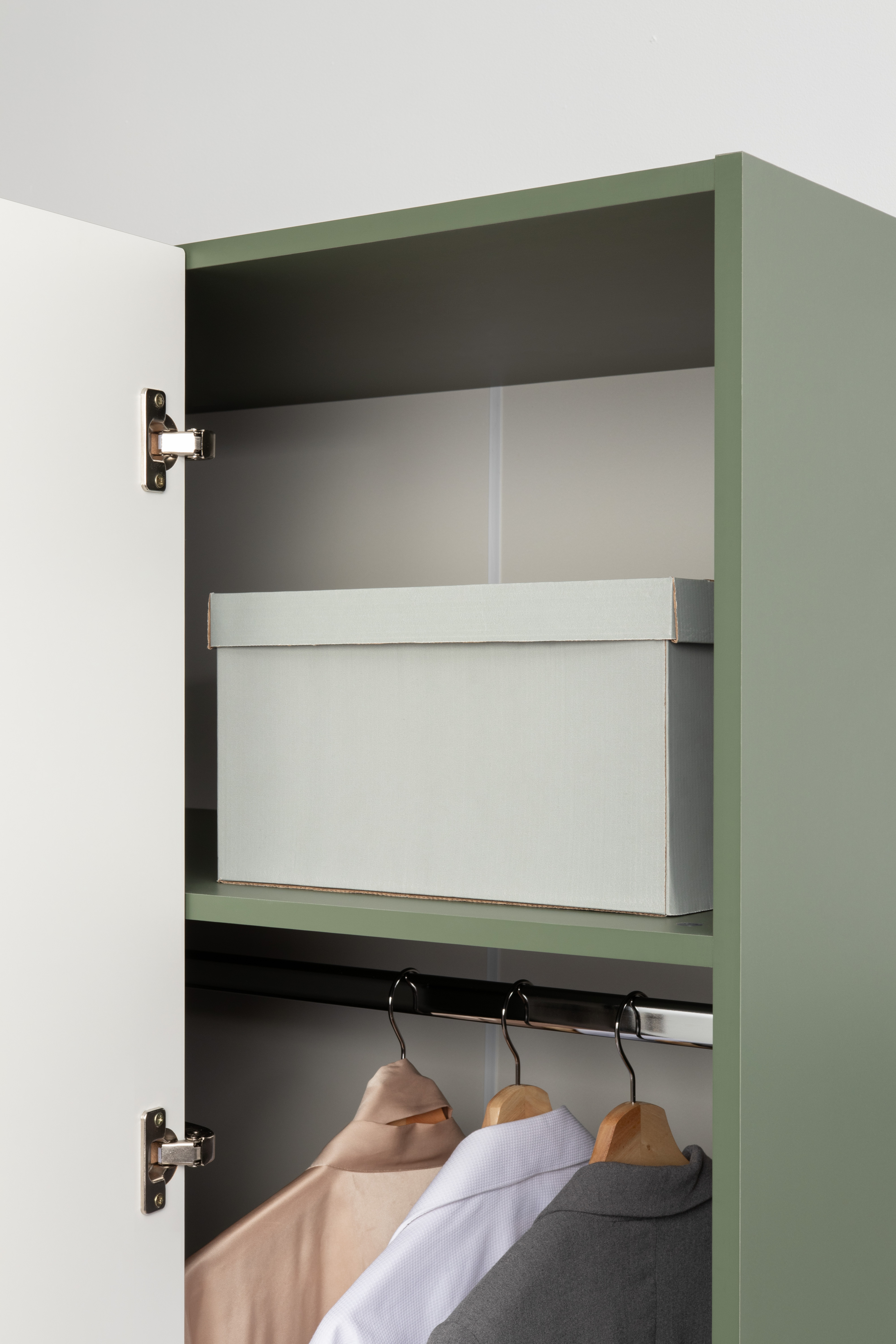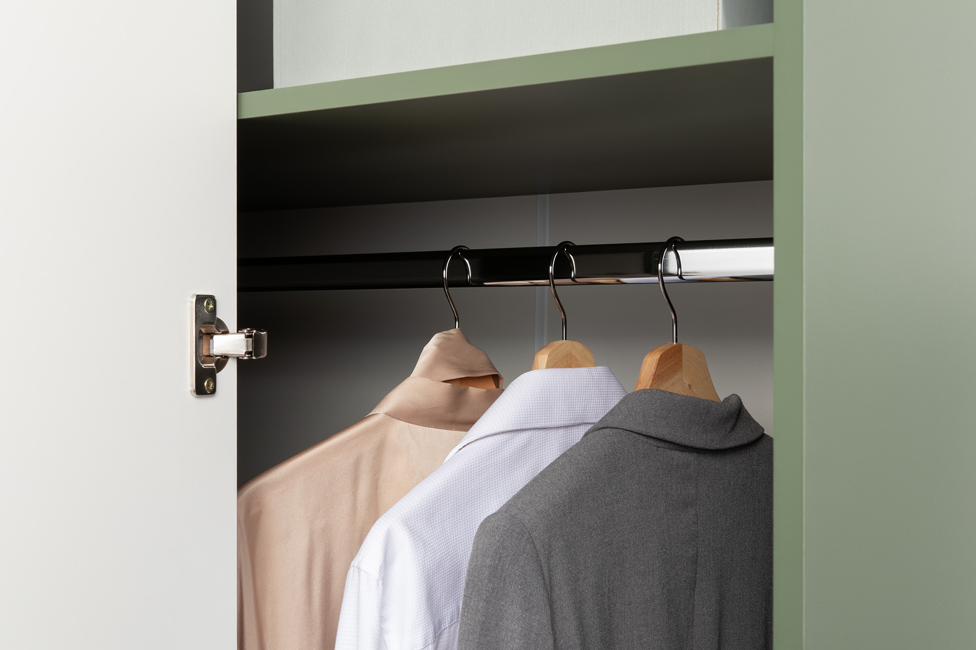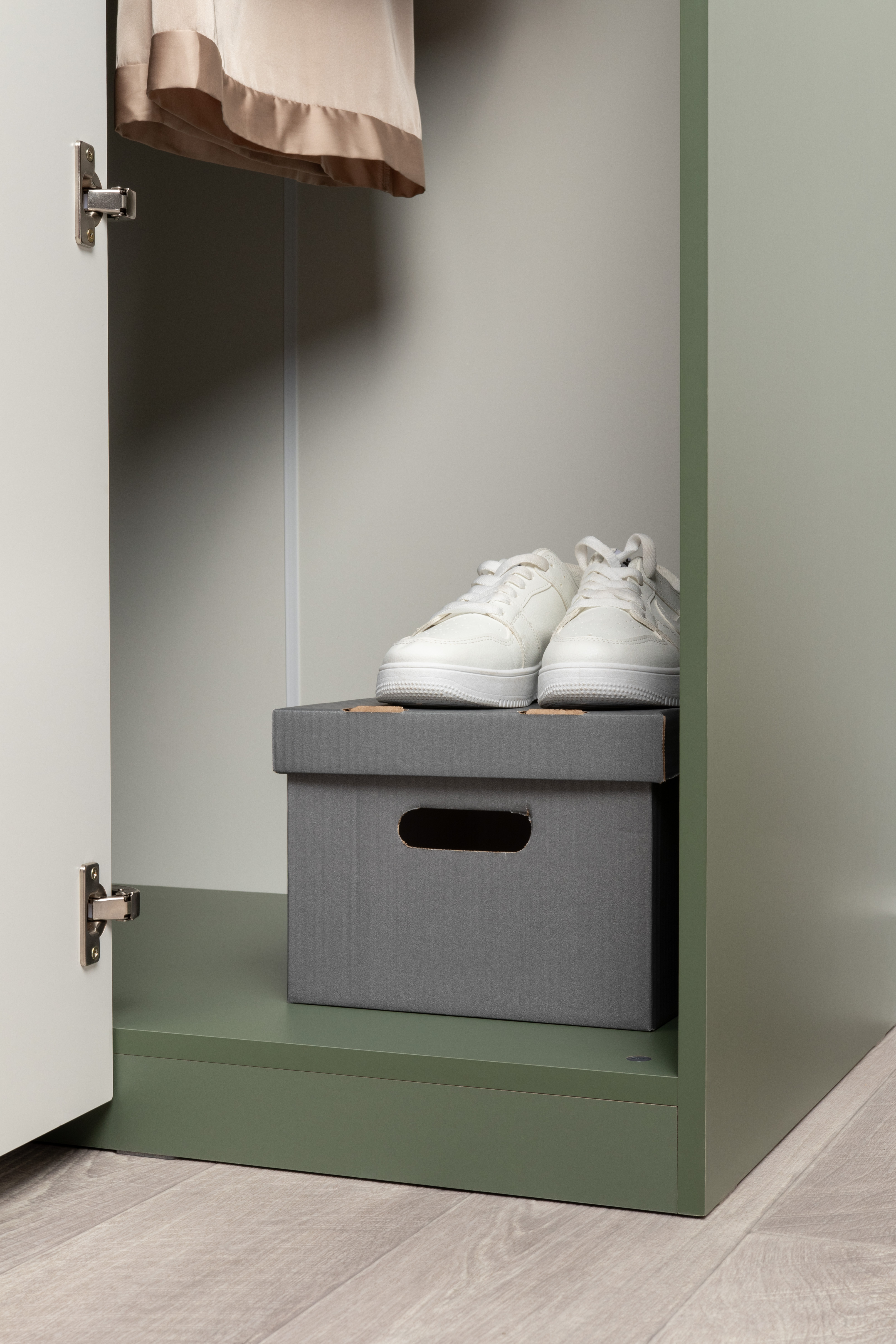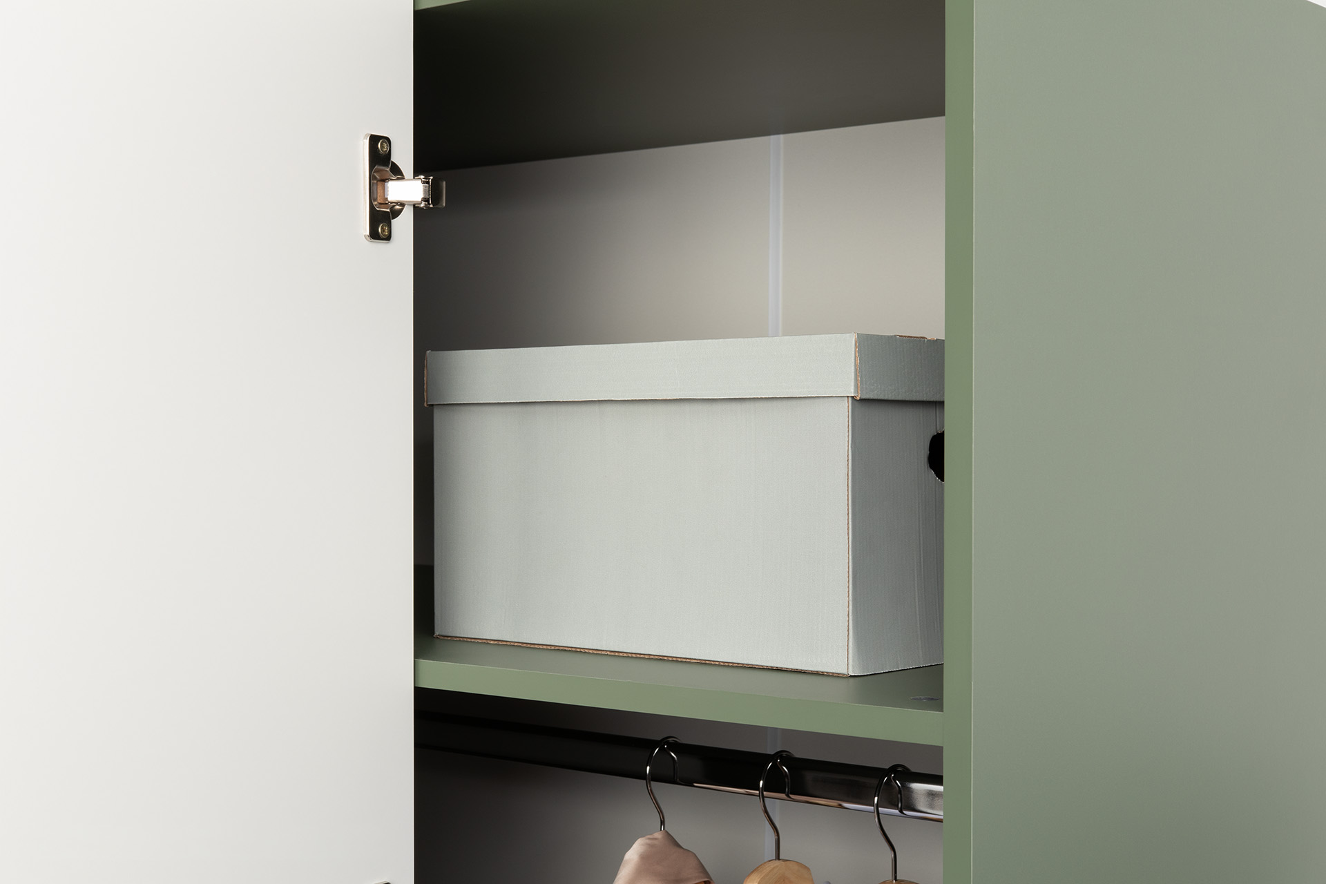 Изящные линии, глубокая фрезеровка фасадов из МДФ и благородные оттенки. Утончённая «Слоновая кость» и изысканная «Олива Шагрень» с глубоким зелёным тоном — создают атмосферу уюта, тепла и благородства. Металлические ручки и опоры золотого цвета придают мебели утончённый блеск, а петли и направляющие с доводчиками обеспечивают плавное и бесшумное закрытие фасадов.