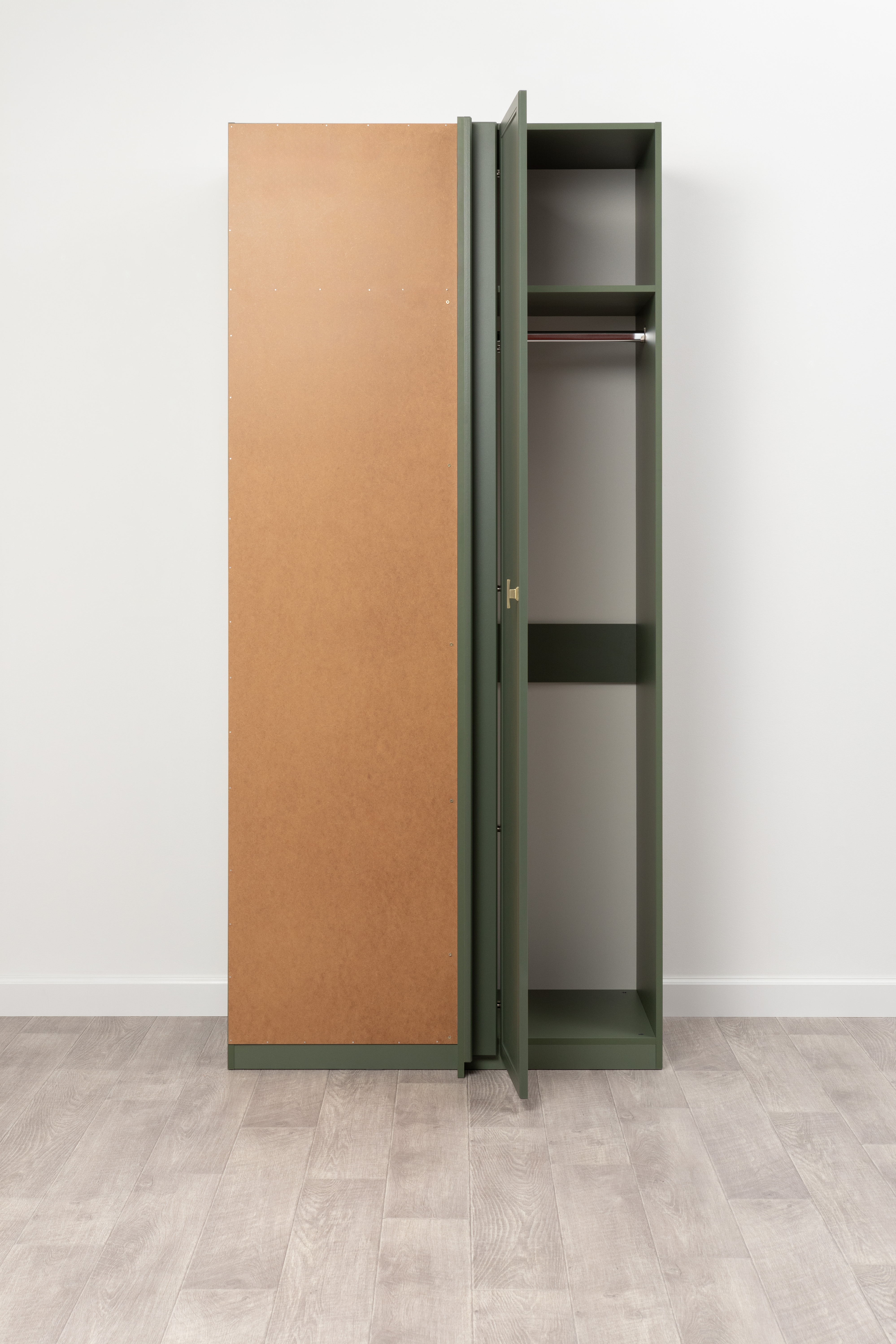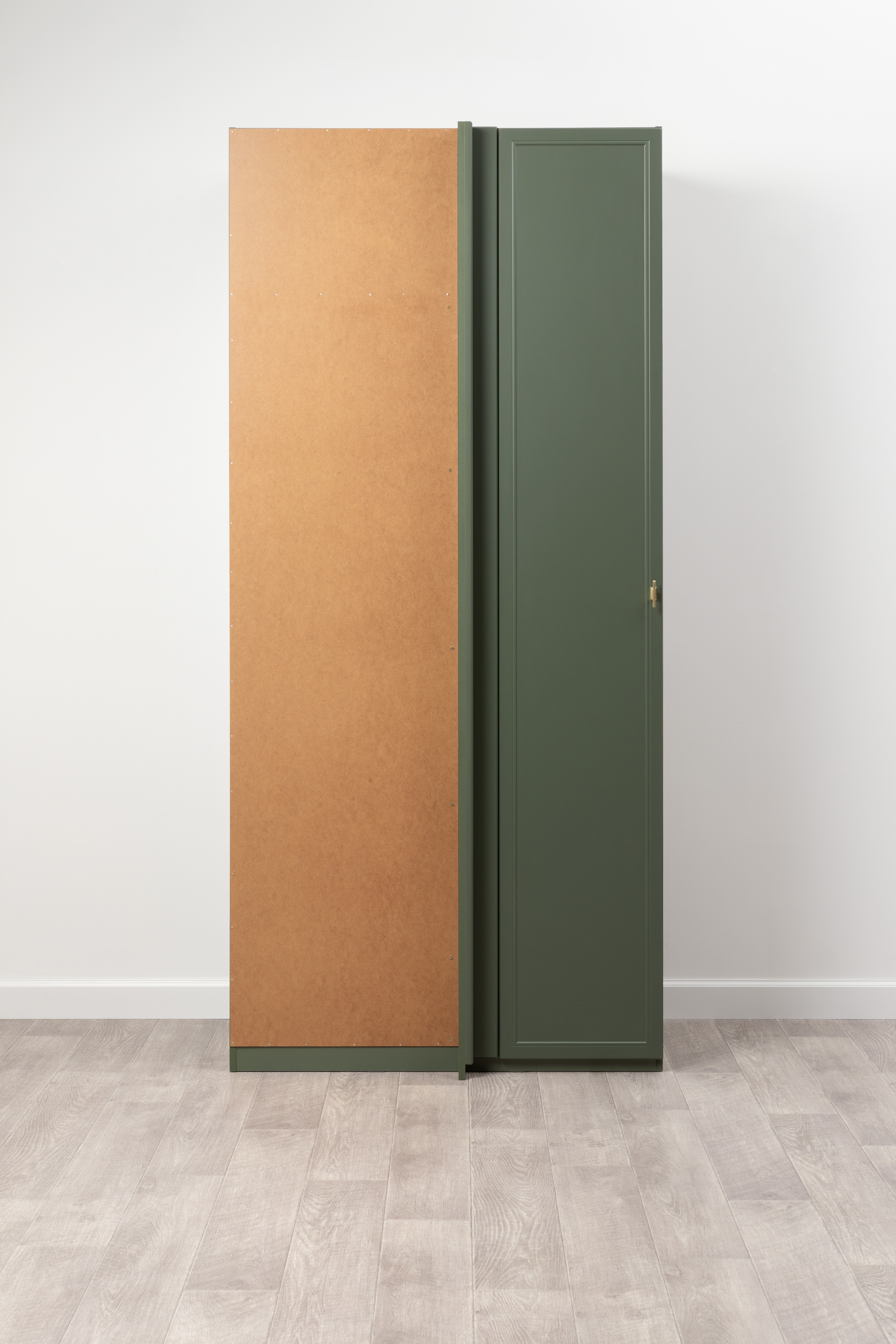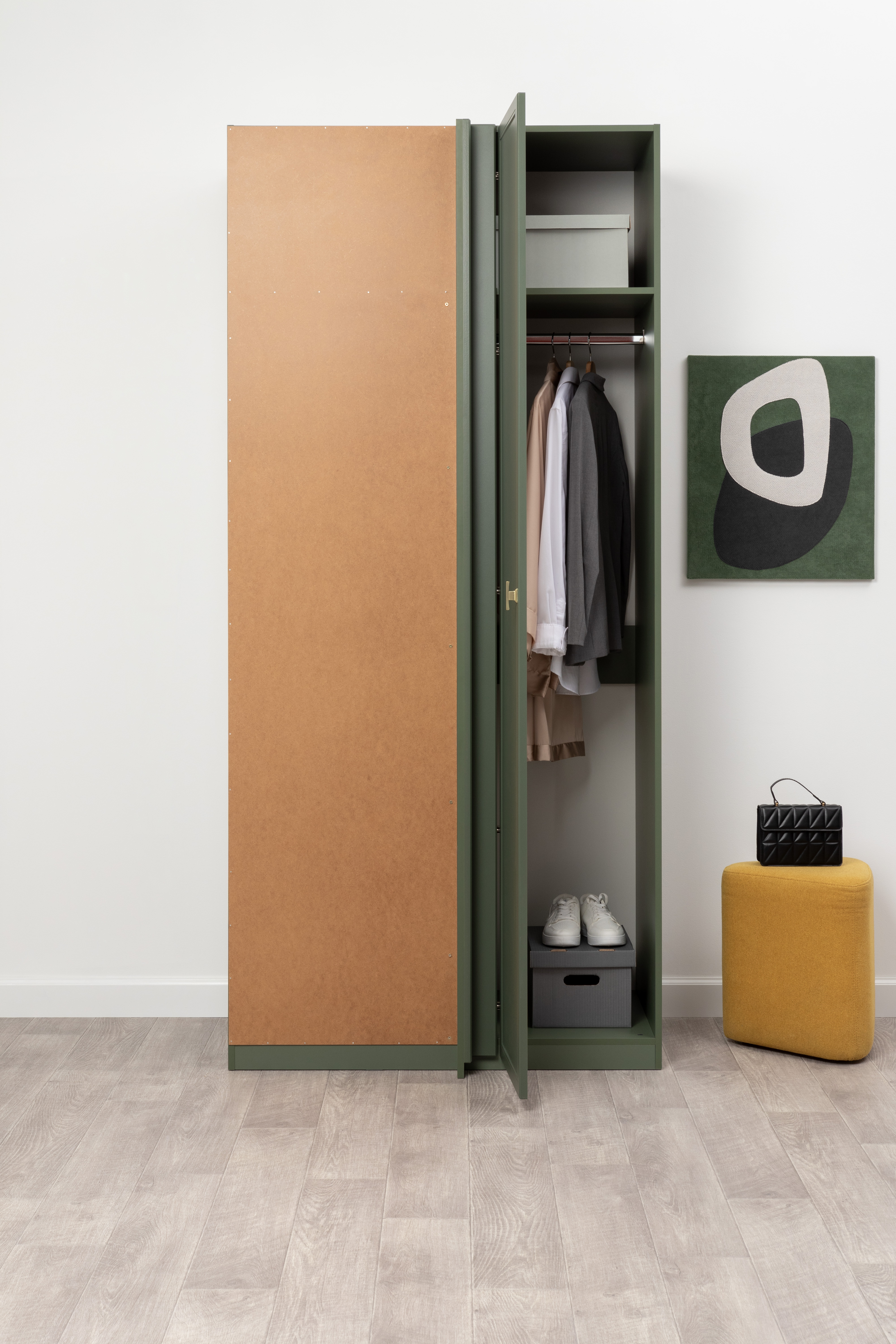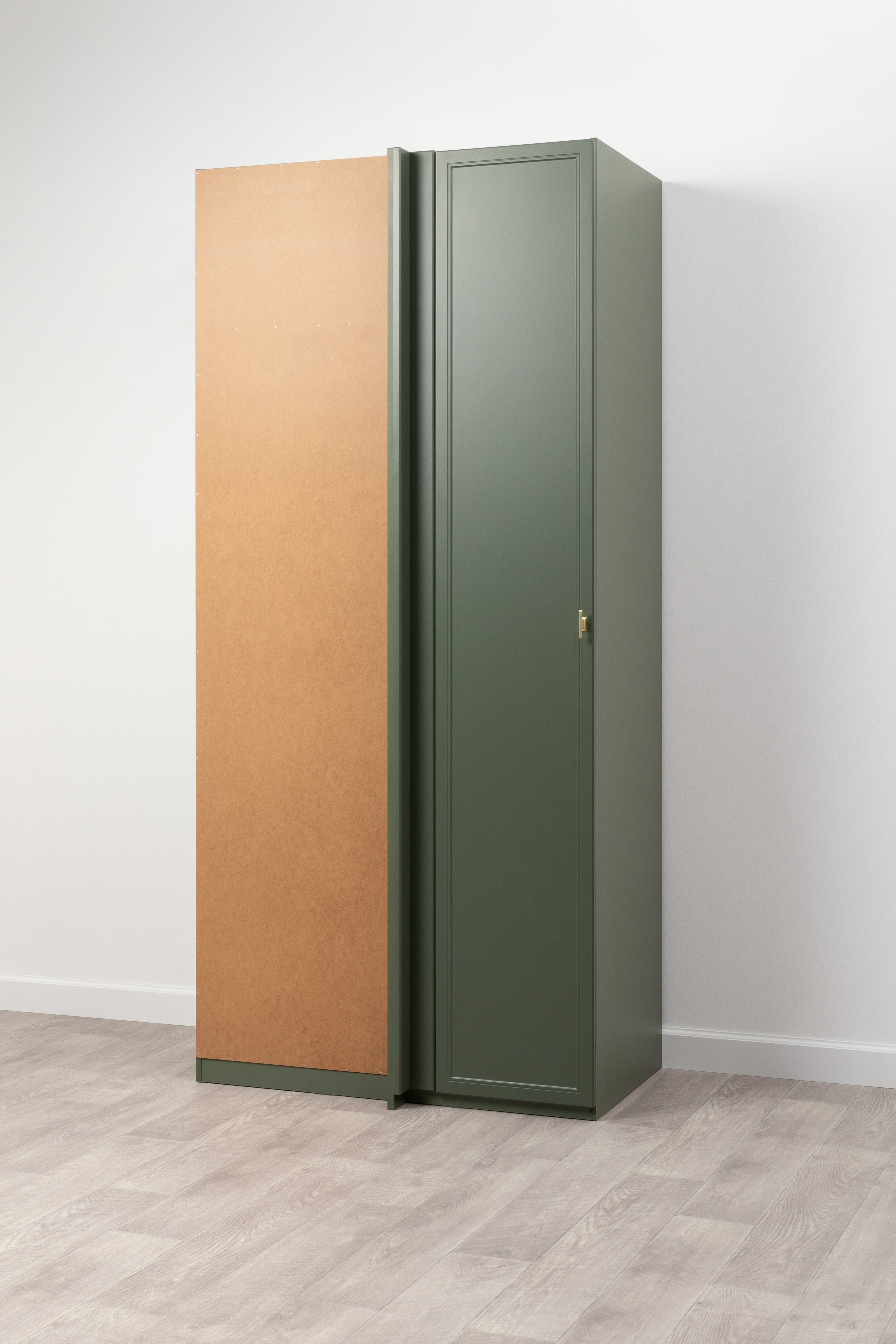 Изящные линии, глубокая фрезеровка фасадов из МДФ и благородные оттенки. Утончённая «Слоновая кость» и изысканная «Олива Шагрень» с глубоким зелёным тоном — создают атмосферу уюта, тепла и благородства. Металлические ручки и опоры золотого цвета придают мебели утончённый блеск, а петли и направляющие с доводчиками обеспечивают плавное и бесшумное закрытие фасадов.
