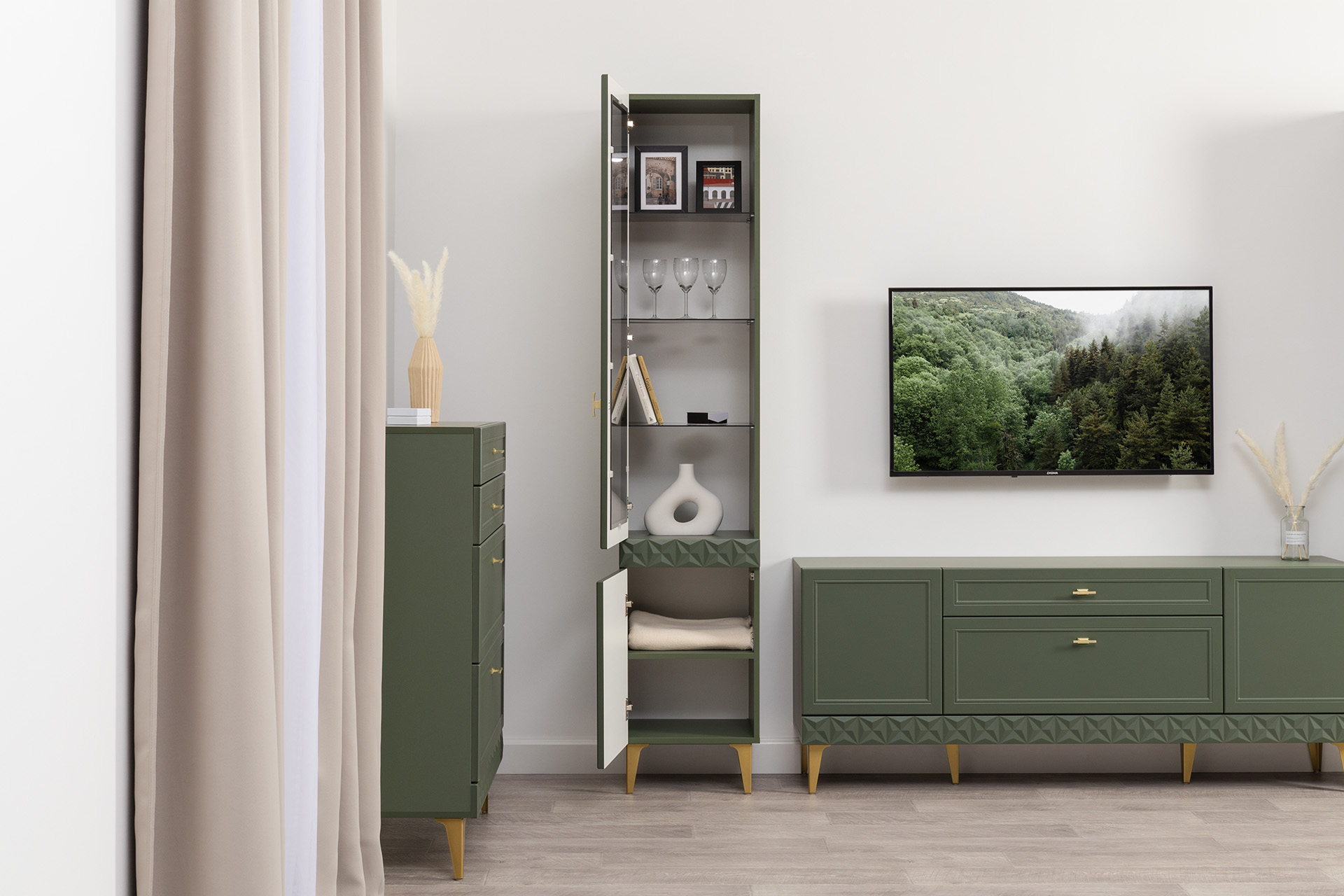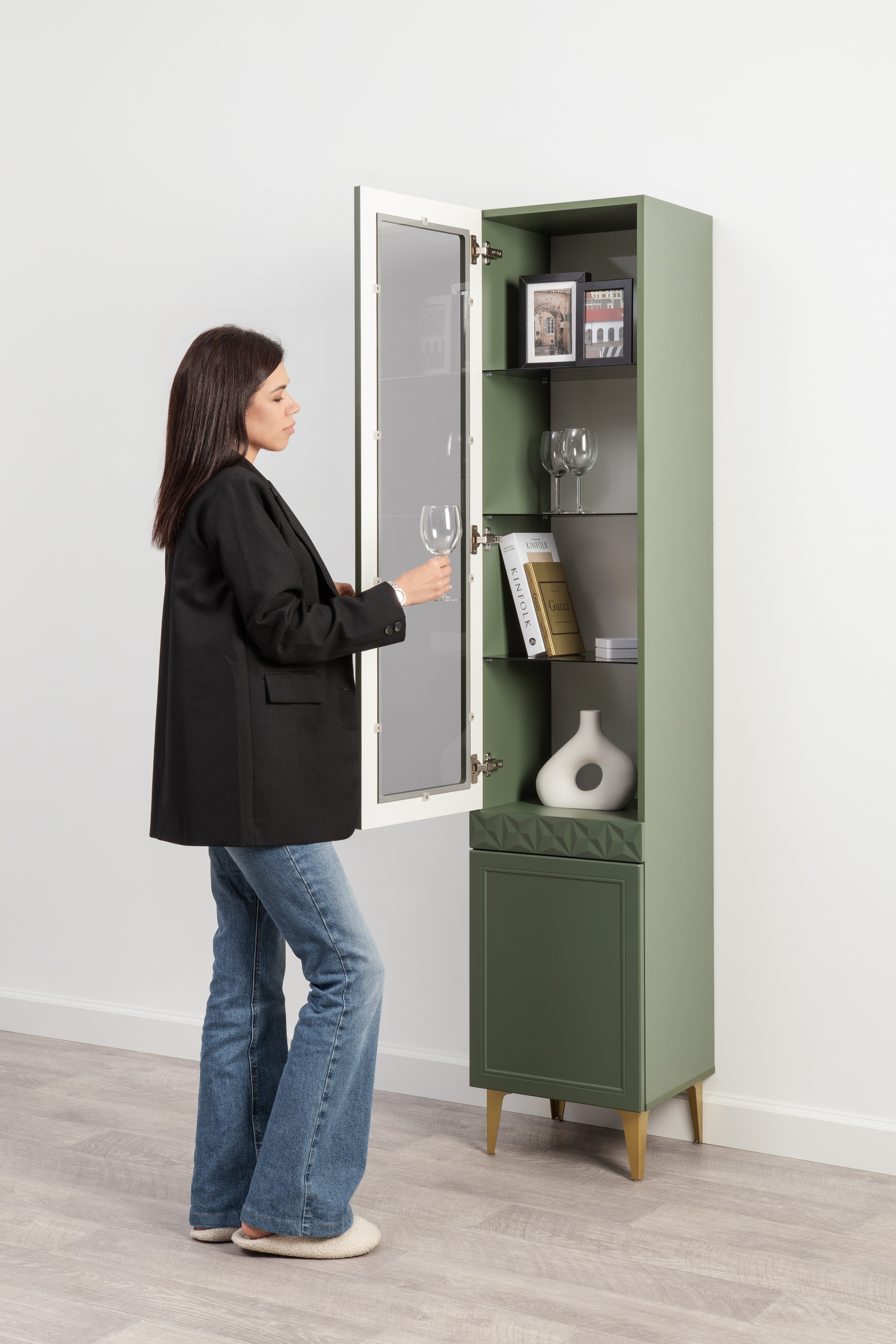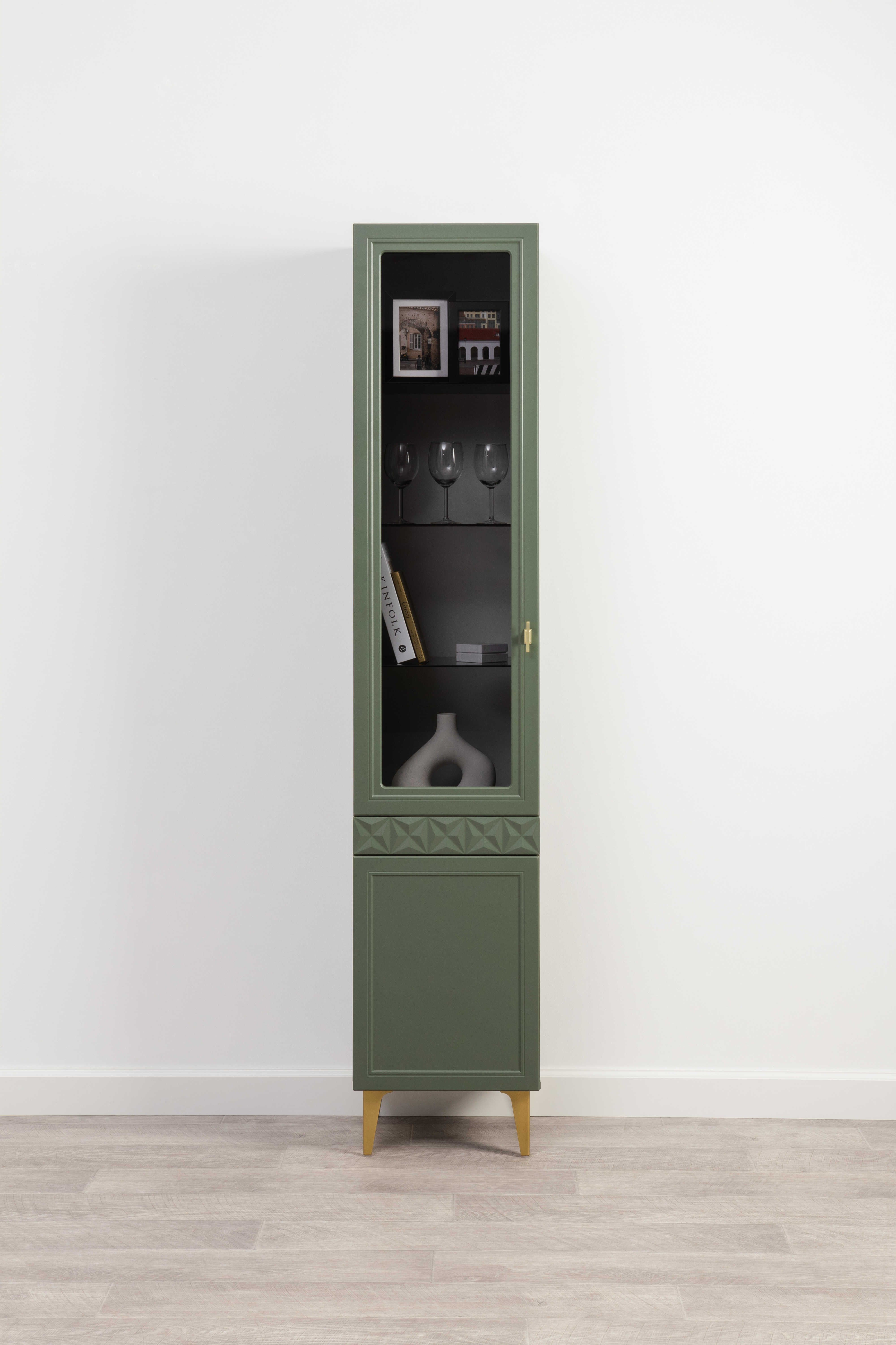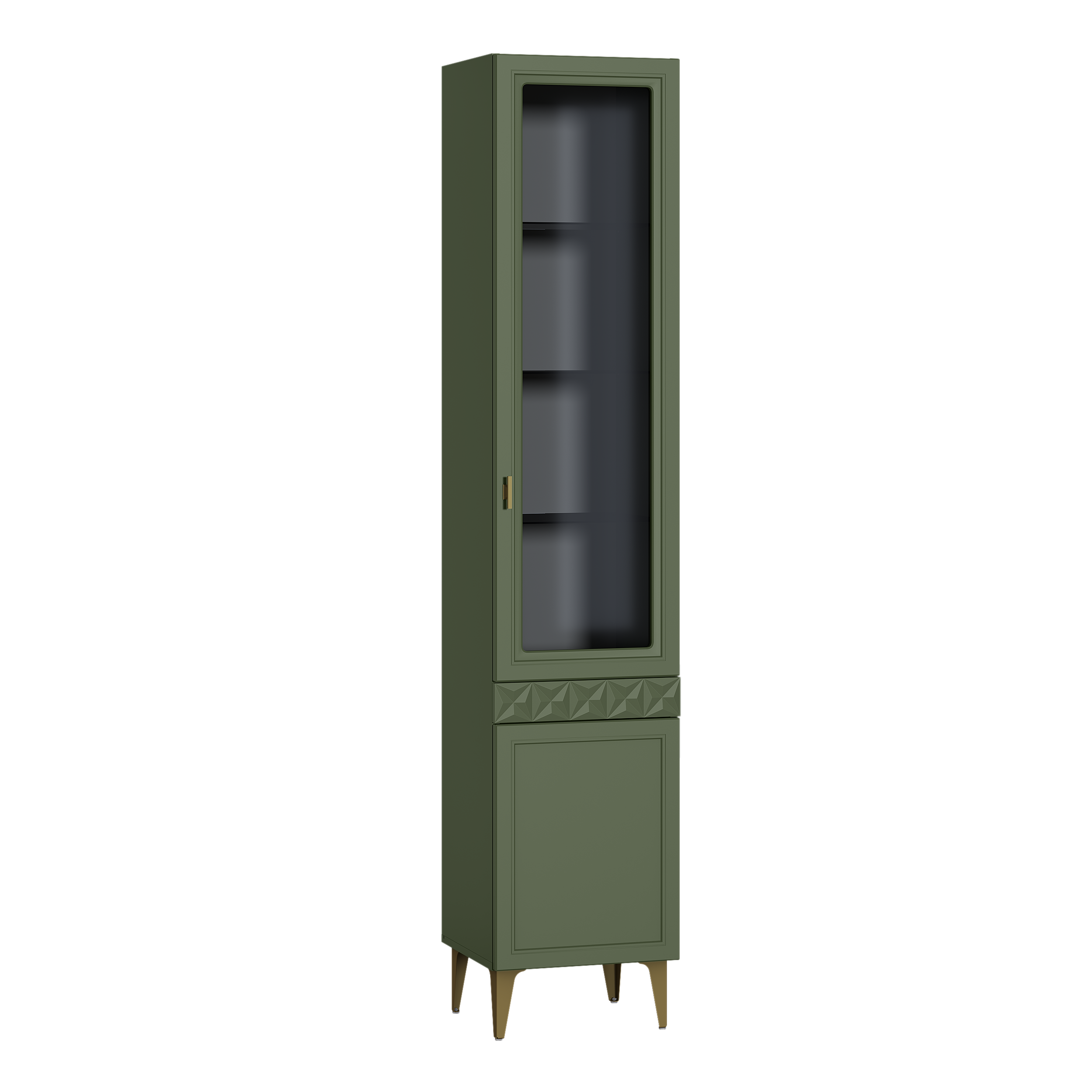 Шкаф-витрина Марион 16.397.01 дымчатый зеленый K521, олива шагрень AG 1050 ПВХ (собирается на любую сторону)