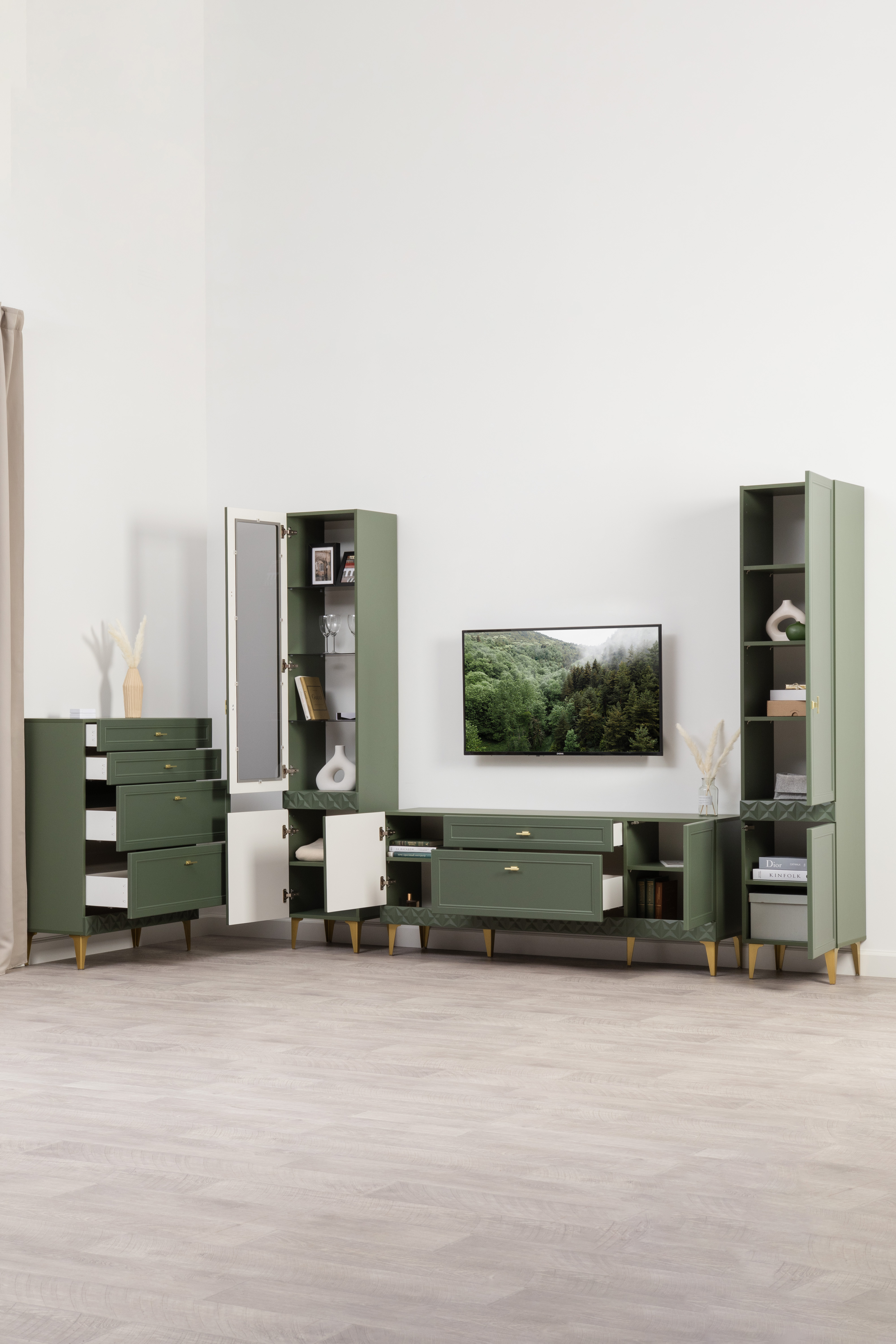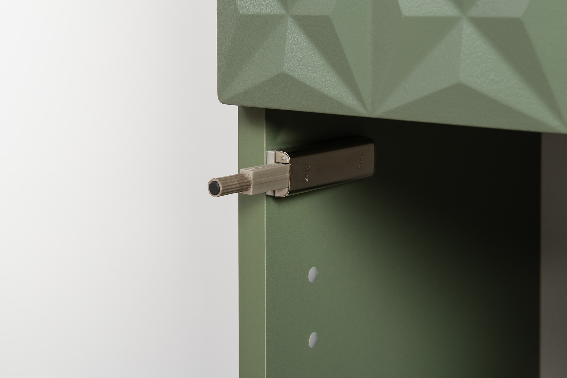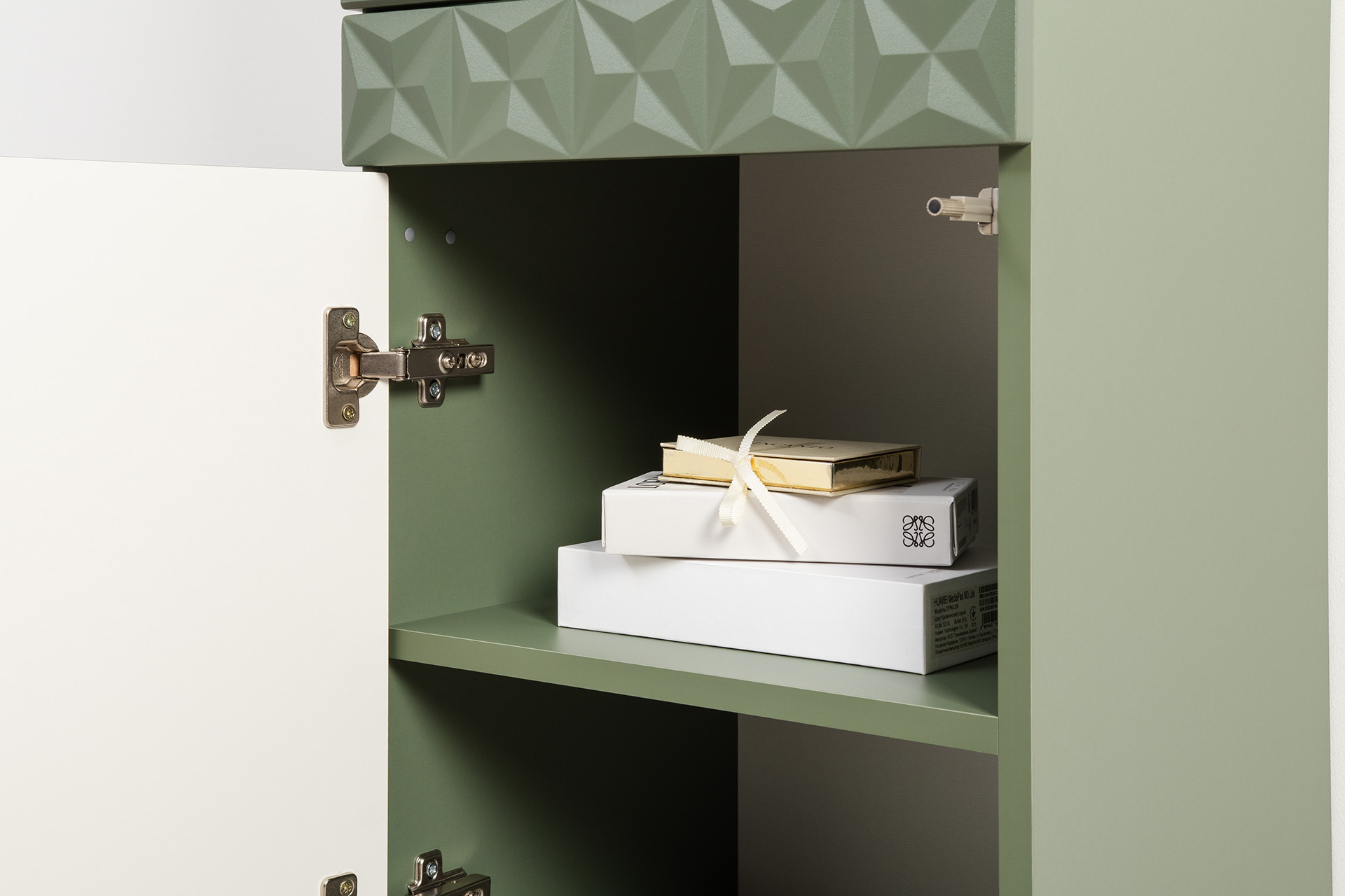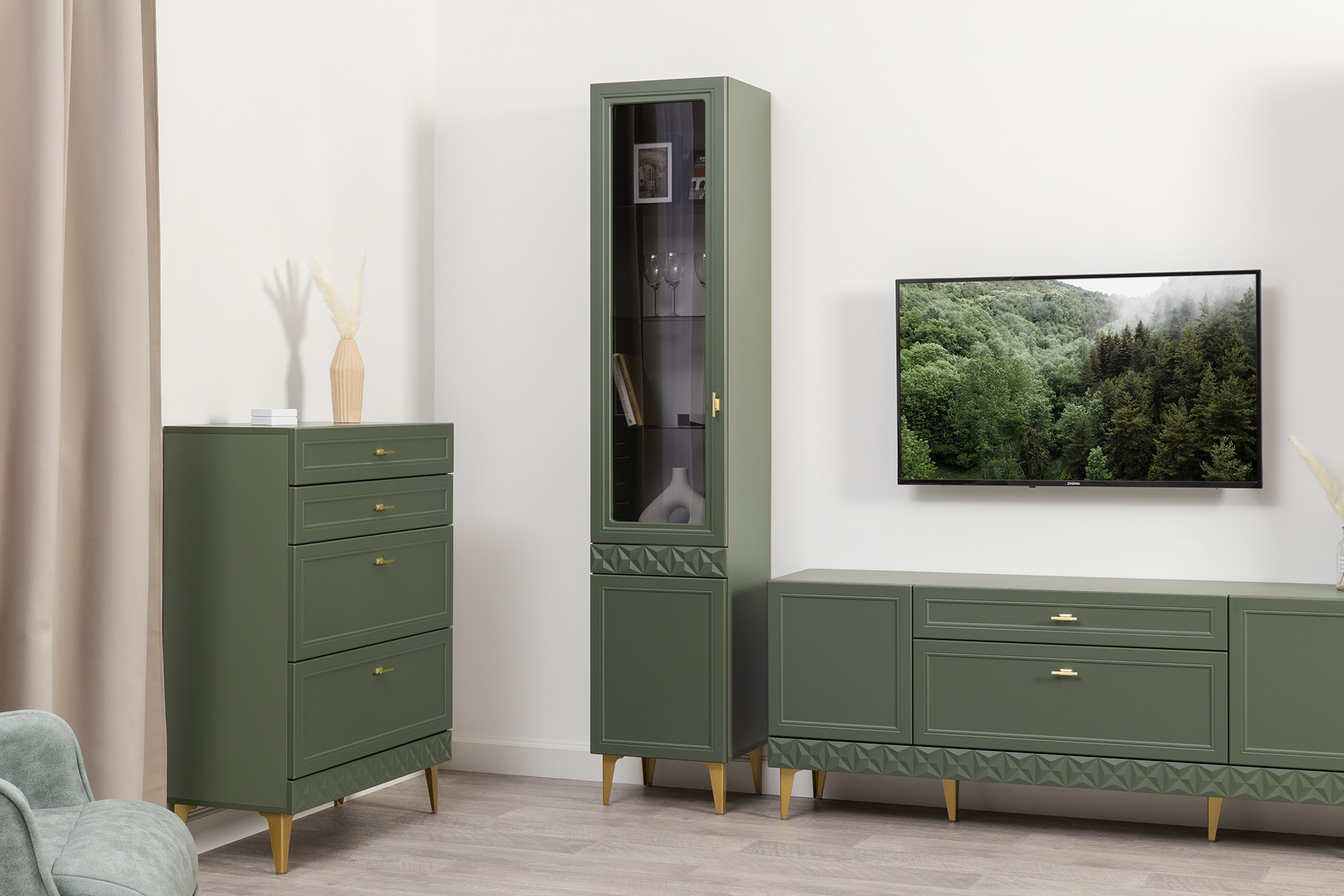 Комод Марион 16.249 дымчатый зеленый K521, олива шагрень AG 1050 ПВХ, белый PE шагрень