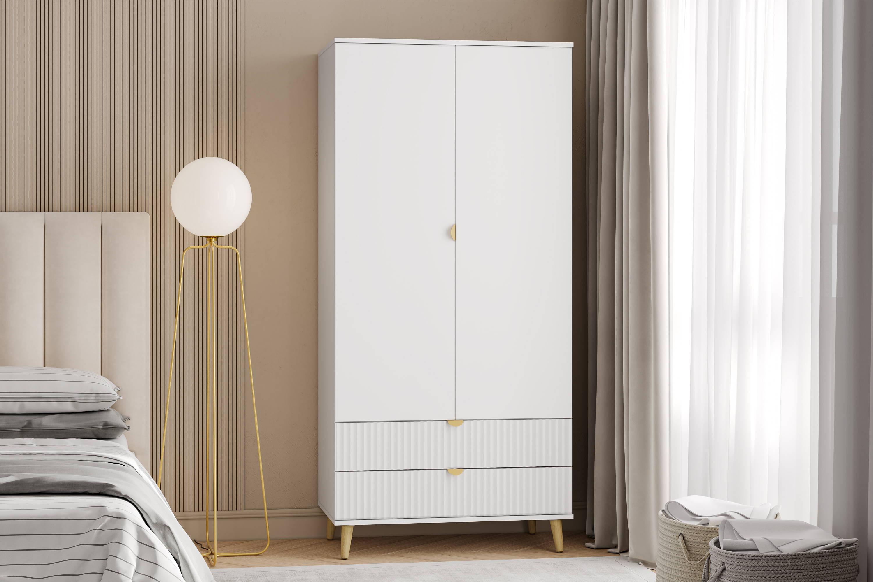 Модульная композиция включает 2 тумбы, оснащенные выдвижными ящиками, которые открываются плавно и бесшумно благодаря шариковым направляющим, комод и шкаф, в котором удобно организовать предметы одежды, при этом высокие опоры облегчают процесс уборки.